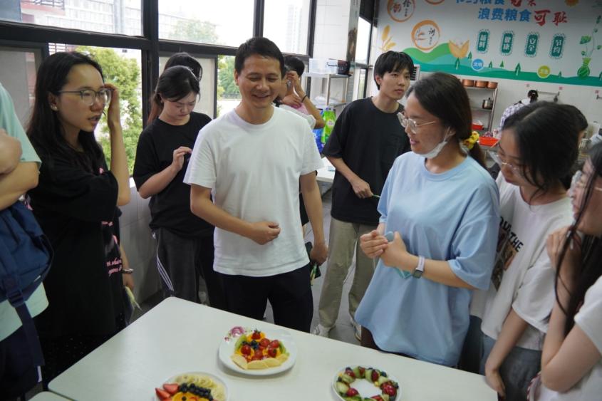 同时,在水果拼盘赛区,选手们以西瓜、香蕉、草莓等新鲜水果为原料,运用雕刻、拼摆等手法,将水果变成精美的艺术作品。田园风光、卡通形象、花卉造型等创意十足的水果拼盘接连诞生,展现出了同学们丰富的想象力与动手能力。随着一盘盘菜肴的完成,评委老师们逐一进行了品尝,分别从色泽搭配、口感风味、造型创意等维度进行综合评分并对同学们娴熟的厨艺给予高度赞扬。