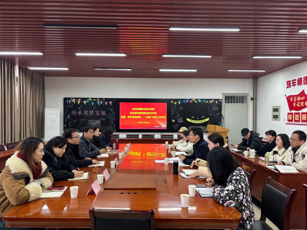 为深入贯彻落实立德树人根本任务,进一步加强兄弟院校学生工作交流,共同探索学生工作新思路、新做法、新经验,提升育人工作成效,12月26日,beat365中文官方网站学工办一行5人,在学院党总支副书记赵超带领下,赴湖北城市建设职业技术学院建筑工程学院开展学生工作专题交流。该校建筑工程学院党总支副书记易仁杰携全体学管人员热情接待,双方围绕党建、学生思想政治教育与日常管理、“一站式”学生社区等工作进行了深入交流探讨。
