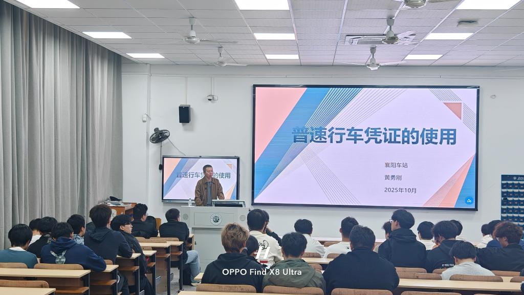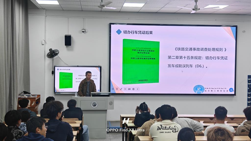 本次讲座以《浅谈普速铁路行车组织应急处置》为题,黄勇刚围绕普速铁路行车组织、普速铁路行车组织应急处置要求、普速铁路行车组织安全控制等三个方面,结合部分典型案例,深入剖析了应急处置中的关键环节,强调行车组织中严格执行规章制度的重要性。同学们认真聆听,积极互动,纷纷表示受益匪浅,对铁路行车安全有了更深刻的认识。