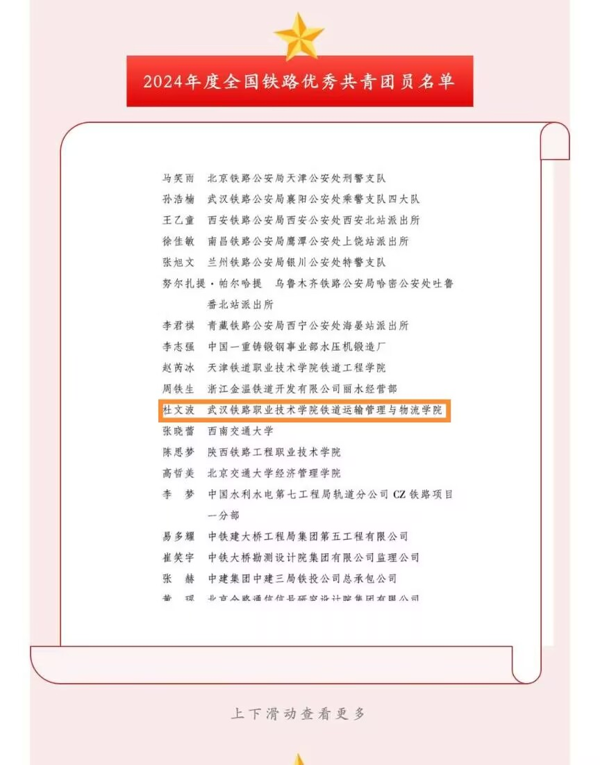 近日,全国铁道团委公布2024年铁路行业“两红两优”表彰名单,beat365官网beat365中文官方网站杜文波同学荣获“2024年度全国铁路优秀共青团员”称号。